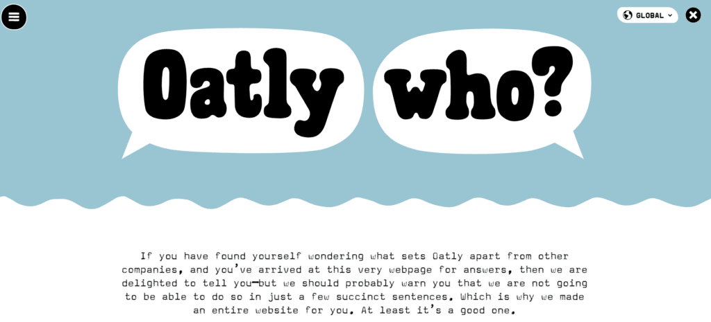 Az Oatly honlapja mind kialakítás, mind copy szempontjából speciális eset: nagyjából mindent, amiről el szokták mondani a szakértők, hogy ezt ne csináld, ők belepakolták a honlapba… És valami miatt mégis működik. Érdemes végiggörgetni, még ha a te ízlésednek túl zajos is, akkor is maradandó élmény lesz. (Szívesen.) Ha jól csinálják, ez a stílus, hossz és elrendezés kombó is lehet nyerő, de különösen fontos az ilyet szakemberekre bízni.